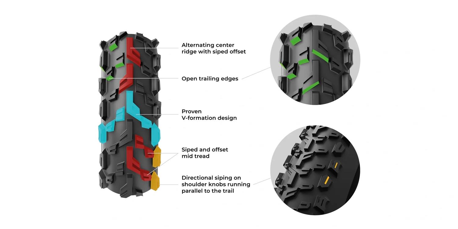 - Aggressive cornering on hard, slippery surfaces thanks to the directional siping on the shoulder knobs running parallel to the trail with variable widths and open trailing edges.