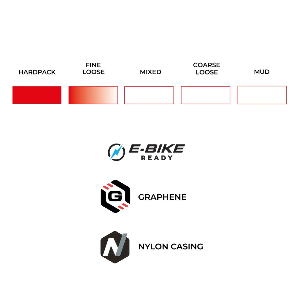 The Terreno T10 Hardpack Gravel Endurance tyre is the most road-efficient model in the Vittoria Gravel Endurance range, engineered for speed and control on compact surfaces. The heart of the T10 is Vittoria’s Endurance Formulation powered by Graphene, delivering proven durability, weather resistance, and consistent performance across seasons and surfaces. A Corsa-inspired and fast rolling slick center strip is paired with revolutionary fish scale shoulders, adapted from the Terreno T30, for added cornering grip and navigating wet or variable terrain. Built with our Endurance Casing, the T10 offers high adaptability and structural strength for long-distance riding, reinforced with a nylon sidewall protection layer and an anti-puncture belt to ensure maximum reliability and peace of mind.