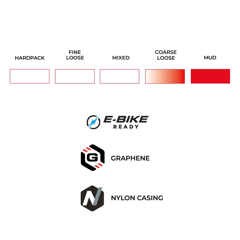Its spacious, high-traction tread pattern powers through thick muck with confidence, while tall, widely spaced knobs and a self-cleaning tread design dig deep and actively shed mud and loamy soil as conditions worsen. Powered by Vittoria’s Endurance Formulation with Graphene, the T90 brings dependable performance, all-weather durability, keeping you in control when grip is at a premium. A self-cleaning tread design actively sheds mud and loamy soil, ensuring consistent traction through wet weather, heavy ruts, and unpredictable terrain.